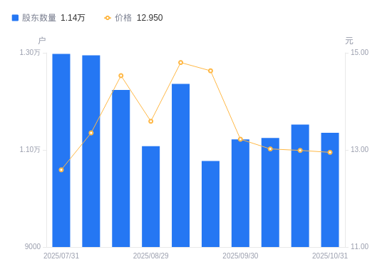近一年(2024年10月31日至2025年10月31日),汇中股份A股股东户数从1.01万户,增加至1.14万户,增幅12.21%,区间股价上涨30.01%。