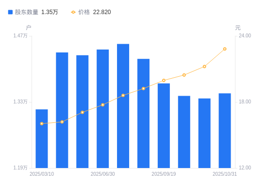 近一年(2024年10月31日至2025年10月31日),丽臣实业A股股东户数从1.35万户,减低至1.35万户,降幅0.09%,区间股价上涨49.44%。
