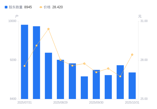 近一年(2024年10月31日至2025年10月31日),锡南科技A股股东户数从9518户,减低至8945户,降幅6.02%,区间股价上涨21.82%。