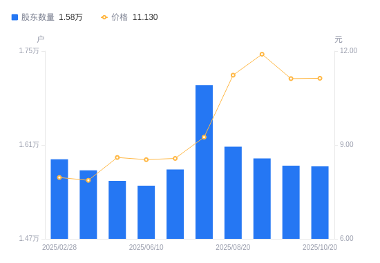 近一年(2024年11月29日至2025年10月20日),ST西发A股股东户数从1.63万户,减低至1.58万户,降幅3.12%,区间股价上涨41.78%。