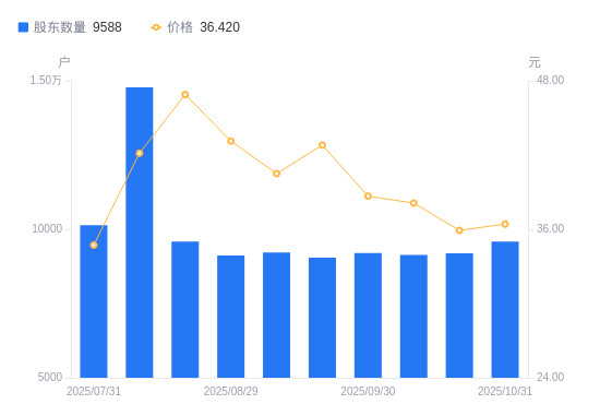近一年(2024年10月31日至2025年10月31日),朗特智能A股股东户数从1.26万户,减低至9588户,降幅23.67%,区间股价上涨35.69%。