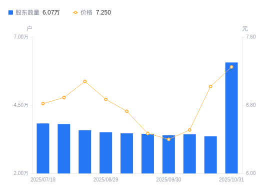 近一年(2024年10月31日至2025年10月31日),石化机械A股股东户数从2.96万户,增加至6.07万户,增幅105.10%,区间股价上涨25.87%。