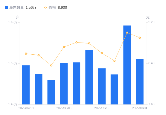 近一年(2024年10月31日至2025年10月31日),皖天然气A股股东户数从1.52万户,增加至1.56万户,增幅2.44%,区间股价上涨5.08%。