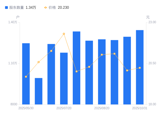 11月3日消息,数据显示,截至2025年10月31日,百龙创园A股股东总户数为1.34万户,较上期(2025年9月30日)增加486户,增幅3.75%。公司最新A股总股本为4.2亿股,其中流通A股4.2亿股,户均持有流通A股数量为3.13万股,较上期减少1174.23股,降幅3.62%;户均持流通A股市值63.27万元,较上期减少1.86万元,降幅2.85%。