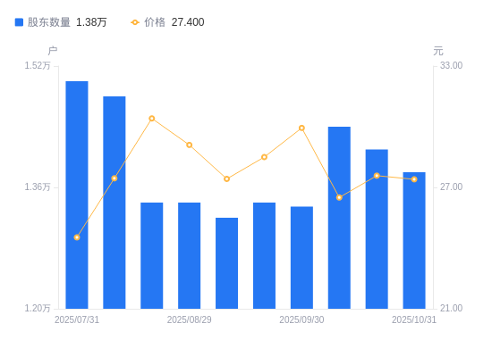 近一年(2024年11月8日至2025年10月31日),图南股份A股股东户数从1.46万户,减低至1.38万户,降幅5.48%,区间股价上涨5.51%。