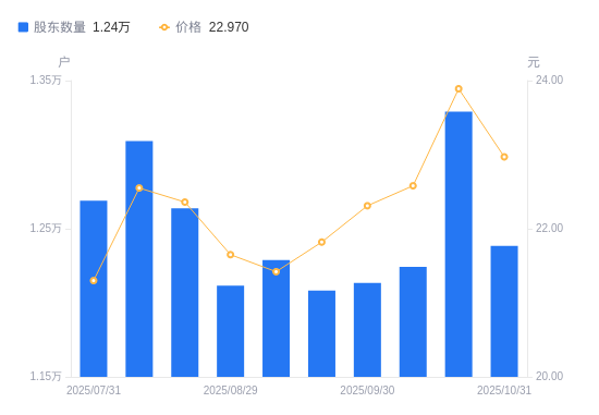 11月3日消息,数据显示,截至2025年10月31日,尤安设计A股股东总户数为1.24万户,较上期(2025年10月20日)减少905户,降幅6.81%。公司最新A股总股本为1.73亿股,其中流通A股1.07亿股,户均持有流通A股数量为8621.17股,较上期增加587.07股,增幅7.31%;户均持流通A股市值19.8万元,较上期增加6093.62元,增幅3.17%。