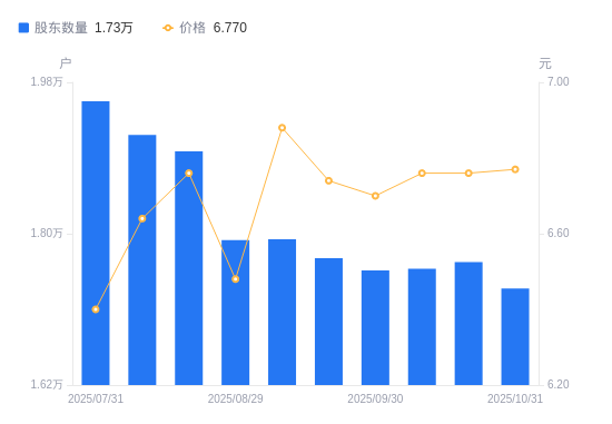 近一年(2024年12月31日至2025年10月31日),龙利得A股股东户数从2.27万户,减低至1.73万户,降幅23.71%,区间股价上涨23.54%。