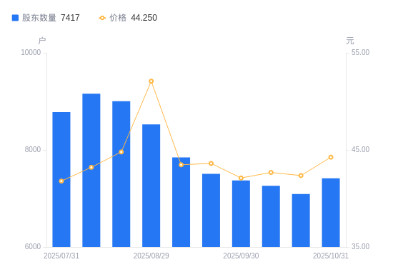 近一年(2024年10月31日至2025年10月31日),民爆光电A股股东户数从9080户,减低至7417户,降幅18.31%,区间股价上涨13.69%。