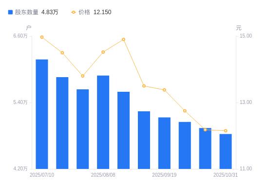 近一年(2024年10月31日至2025年10月31日),兆日科技A股股东户数从5.17万户,减低至4.83万户,降幅6.49%,区间股价上涨18.08%。