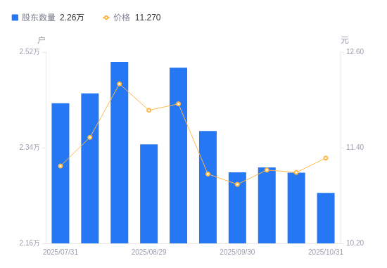 近一年(2024年10月31日至2025年10月31日),中粮科工A股股东户数从2.59万户,减低至2.26万户,降幅12.83%,区间股价下跌5.05%。