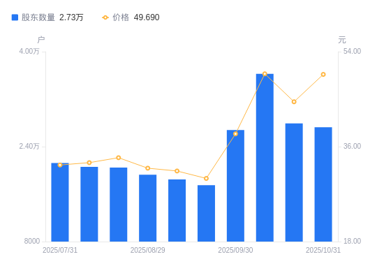 近一年(2024年10月31日至2025年10月31日),哈焊华通A股股东户数从1.1万户,增加至2.73万户,增幅148.28%,区间股价上涨175.14%。