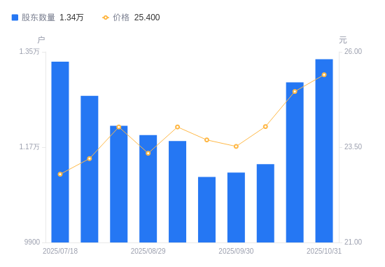 近一年(2024年10月31日至2025年10月31日),未来电器A股股东户数从1.24万户,增加至1.34万户,增幅7.60%,区间股价上涨24.51%。