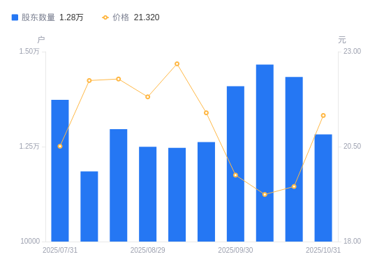 近一年(2024年10月31日至2025年10月31日),西麦食品A股股东户数从1.72万户,减低至1.28万户,降幅25.35%,区间股价上涨73.45%。