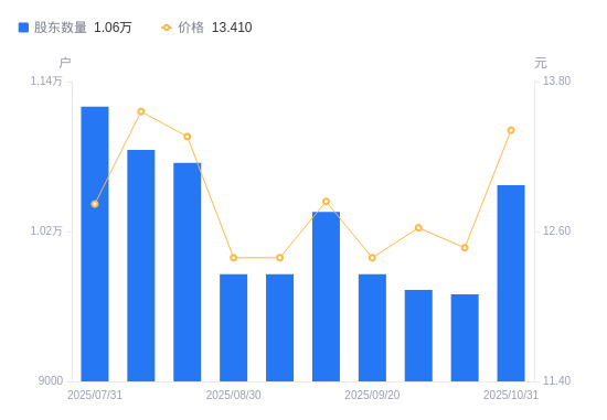 近一年(2024年10月31日至2025年10月31日),播恩集团A股股东户数从1.3万户,减低至1.06万户,降幅18.39%,区间股价上涨19.84%。