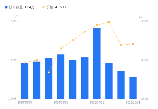 近一年(2024年10月31日至2025年10月31日),朗威股份A股股东户数从1.37万户,减低至1.34万户,降幅2.12%,区间股价上涨25.72%。