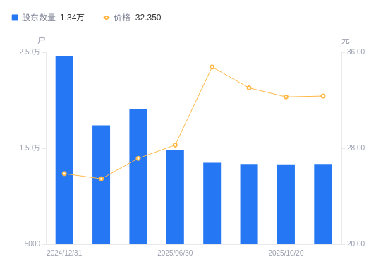 近一年(2024年12月31日至2025年10月31日),小方制药A股股东户数从2.46万户,减低至1.34万户,降幅45.71%,区间股价上涨24.66%。