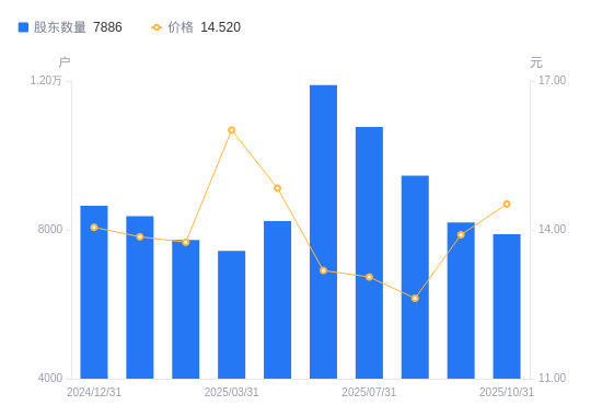 近一年(2024年11月29日至2025年10月31日),锦盛新材A股股东户数从1.01万户,减低至7886户,降幅21.72%,区间股价上涨11.35%。