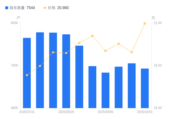 近一年(2024年11月20日至2025年10月31日),*ST声迅A股股东户数从1.35万户,减低至7544户,降幅43.96%,区间股价下跌14.54%。