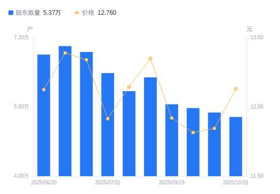 近一年(2024年11月20日至2025年10月31日),湖南发展A股股东户数从5.04万户,增加至5.37万户,增幅6.52%,区间股价上涨23.40%。