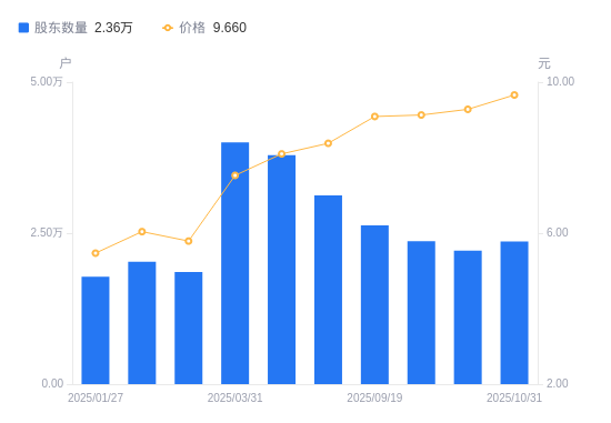 11月4日消息,数据显示,截至2025年10月31日,海默科技A股股东总户数为2.36万户,较上期(2025年10月20日)增加1505户,增幅6.80%。公司最新A股总股本为5.1亿股,其中流通A股3.45亿股,户均持有流通A股数量为1.46万股,较上期减少992.38股,降幅6.37%;户均持流通A股市值14.09万元,较上期减少3667.25元,降幅2.54%。