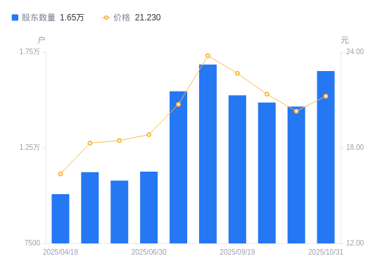 近一年(2024年10月31日至2025年10月31日),国安达A股股东户数从1.08万户,增加至1.65万户,增幅52.60%,区间股价上涨10.34%。
