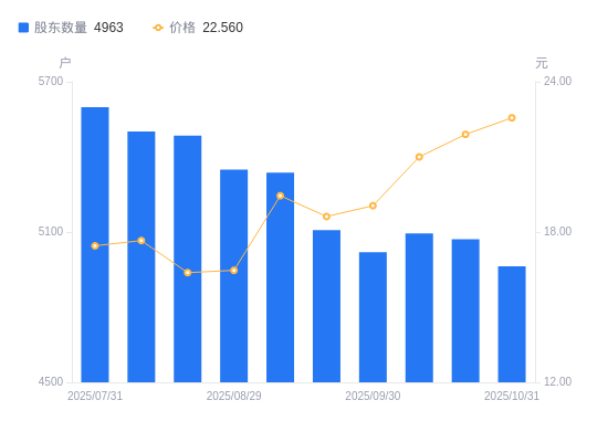 近一年(2024年10月31日至2025年10月31日),*ST和科A股股东户数从8118户,减低至4963户,降幅38.86%,区间股价上涨46.97%。