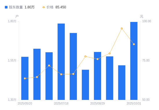 近一年(2024年10月31日至2025年10月31日),海力风电A股股东户数从2.18万户,减低至1.8万户,降幅17.76%,区间股价上涨27.52%。