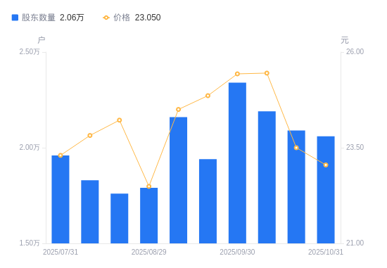 近一年(2024年10月31日至2025年10月31日),多利科技A股股东户数从1.77万户,增加至2.06万户,增幅16.38%,区间股价上涨20.25%。