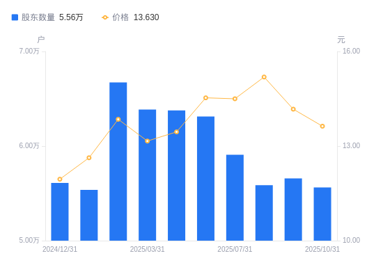 近一年(2024年10月31日至2025年10月31日),博彦科技A股股东户数从6.42万户,减低至5.56万户,降幅13.32%,区间股价上涨11.55%。