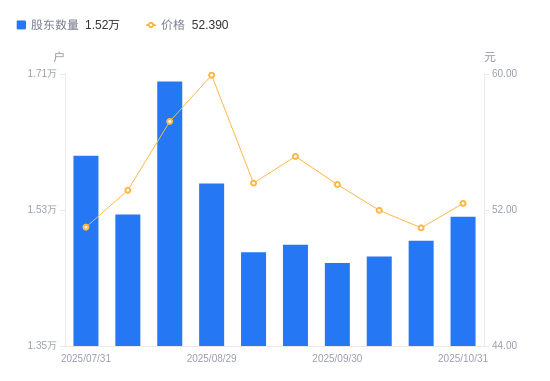 近一年(2024年12月10日至2025年10月31日),光庭信息A股股东户数从1.73万户,减低至1.52万户,降幅11.93%,区间股价下跌7.11%。