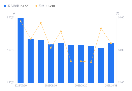 近一年(2024年12月10日至2025年10月31日),晨光新材A股股东户数从2.4万户,减低至2.17万户,降幅9.41%,区间股价下跌0.90%。