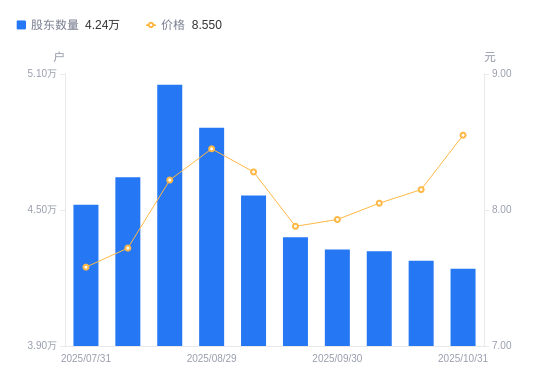 近一年(2024年12月31日至2025年10月31日),九鼎新材A股股东户数从3.57万户,增加至4.24万户,增幅18.75%,区间股价上涨61.75%。