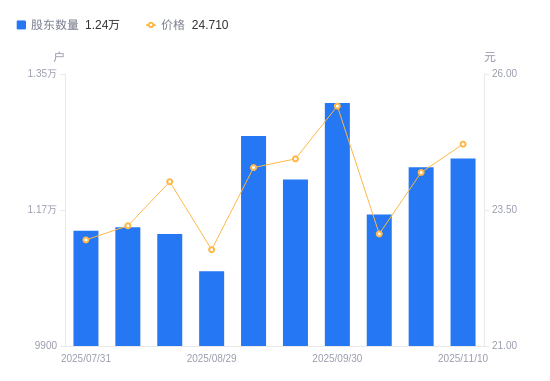 近一年(2024年11月20日至2025年11月10日),中瑞股份A股股东户数从1.28万户,减低至1.24万户,降幅3.11%,区间股价下跌8.41%。