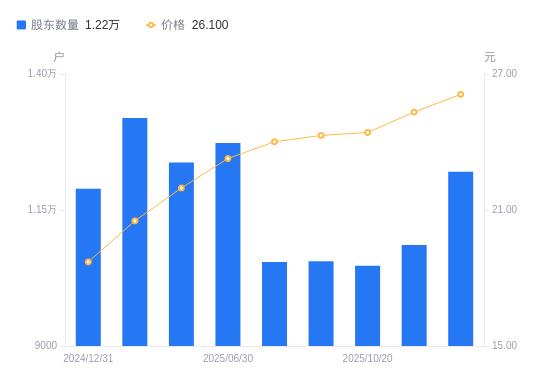 近一年(2024年12月31日至2025年11月10日),通达创智A股股东户数从1.19万户,增加至1.22万户,增幅2.63%,区间股价上涨37.01%。
