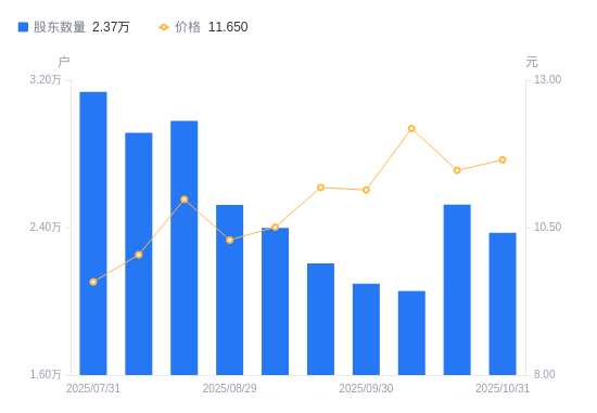11月11日消息,数据显示,截至2025年11月10日,联发股份A股股东总户数为2.31万户,较上期(2025年10月31日)减少600户,降幅2.53%。公司最新A股总股本为3.24亿股,其中流通A股3.23亿股,户均持有流通A股数量为1.4万股,较上期增加353.79股,增幅2.60%;户均持流通A股市值16.71万元,较上期增加8317.09元,增幅5.24%。