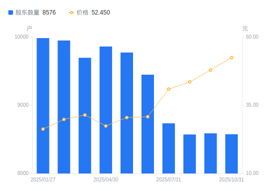 近一年(2024年11月30日至2025年10月31日),普蕊斯A股股东户数从9989户,减低至8576户,降幅14.15%,区间股价上涨68.06%。