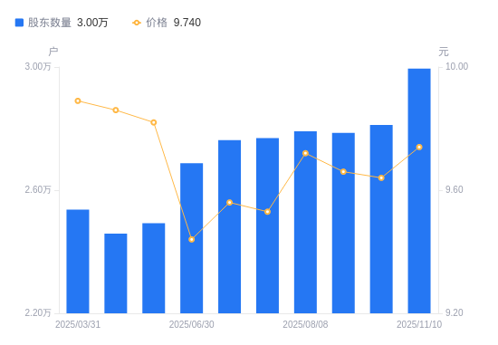 近一年(2024年12月20日至2025年11月10日),蓝天燃气A股股东户数从2.36万户,增加至3万户,增幅26.65%,区间股价下跌7.15%。