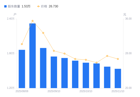 近一年(2024年12月20日至2025年11月10日),逸豪新材A股股东户数从1.64万户,减低至1.53万户,降幅6.33%,区间股价上涨21.33%。