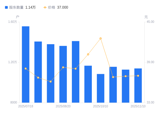 近一年(2024年11月20日至2025年11月10日),凯旺科技A股股东户数从1.6万户,减低至1.14万户,降幅28.61%,区间股价上涨2.35%。