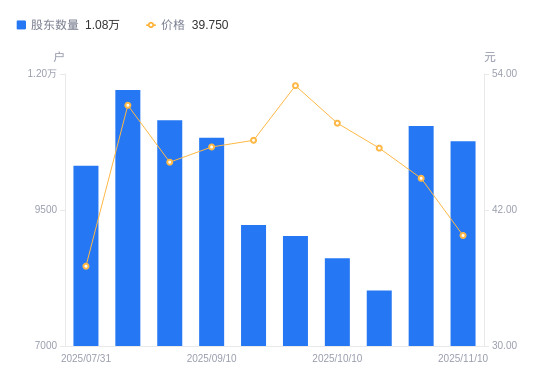 近一年(2024年11月20日至2025年11月10日),信邦智能A股股东户数从1.17万户,减低至1.08万户,降幅7.92%,区间股价上涨50.80%。