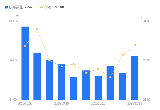 近一年(2024年11月20日至2025年11月10日),锡南科技A股股东户数从9257户,增加至9299户,增幅0.45%,区间股价上涨21.68%。