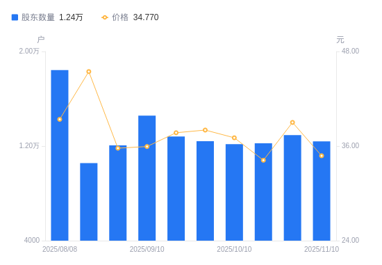 近一年(2024年12月10日至2025年11月10日),唯万密封A股股东户数从1.5万户,减低至1.24万户,降幅17.27%,区间股价上涨60.33%。