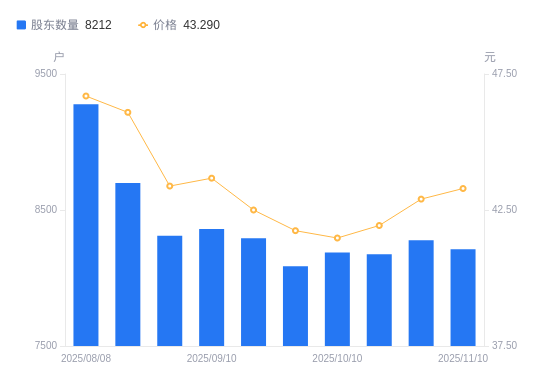 近一年(2024年12月31日至2025年11月10日),万邦医药A股股东户数从8673户,减低至8212户,降幅5.32%,区间股价上涨10.49%。