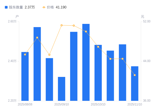 近一年(2024年11月20日至2025年11月10日),肇民科技A股股东户数从1.63万户,增加至2.37万户,增幅45.66%,区间股价上涨130.37%。