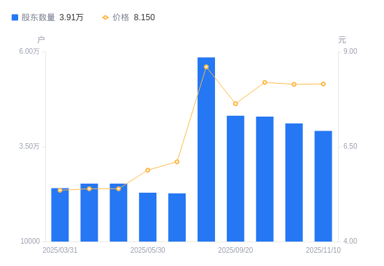 近一年(2024年12月20日至2025年11月10日),准油股份A股股东户数从2.54万户,增加至3.91万户,增幅53.76%,区间股价上涨46.32%。