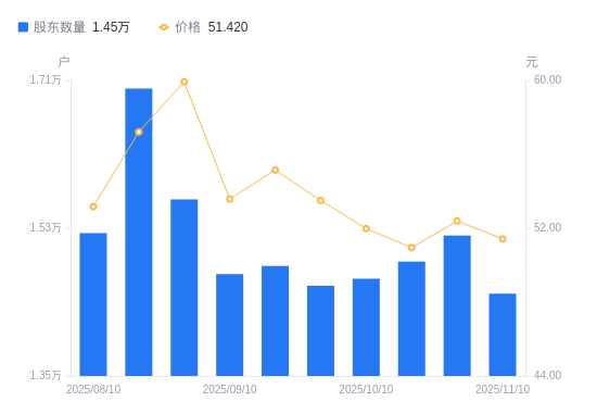 近一年(2024年12月10日至2025年11月10日),光庭信息A股股东户数从1.73万户,减低至1.45万户,降幅16.03%,区间股价下跌8.83%。