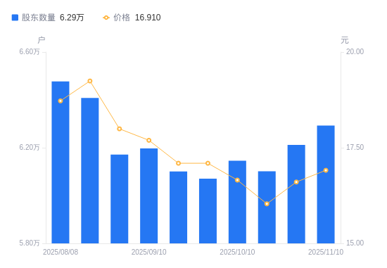近一年(2024年11月20日至2025年11月10日),欧普康视A股股东户数从6.72万户,减低至6.29万户,降幅6.41%,区间股价下跌12.02%。