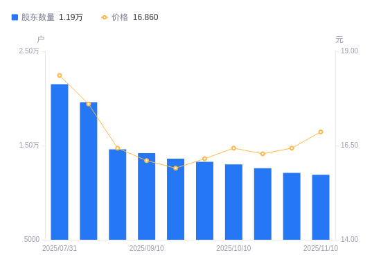 11月11日消息,数据显示,截至2025年11月10日,筑博设计A股股东总户数为1.19万户,较上期(2025年10月31日)减少200户,降幅1.65%。公司最新A股总股本为1.61亿股,其中流通A股1.13亿股,户均持有流通A股数量为9511.91股,较上期增加157.22股,增幅1.68%;户均持流通A股市值16.04万元,较上期增加6673.27元,增幅4.34%。