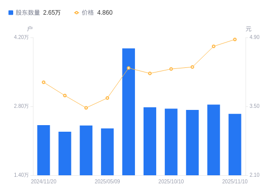 近一年(2024年11月20日至2025年11月10日),茂化实华A股股东户数从2.42万户,增加至2.65万户,增幅9.46%,区间股价上涨23.66%。