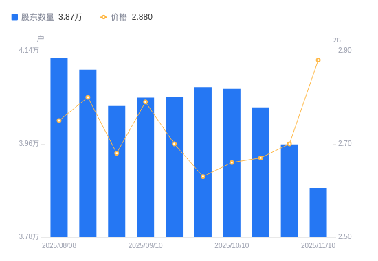 近一年(2024年12月31日至2025年11月10日),佳隆股份A股股东户数从5.29万户,减低至3.87万户,降幅26.80%,区间股价上涨11.11%。